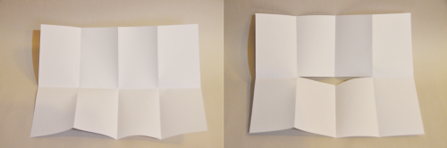 3. Fold the paper lengthwise (long ends touching), hold the paper at either end, and fold the sheet into itself to form an 8-page booklet.