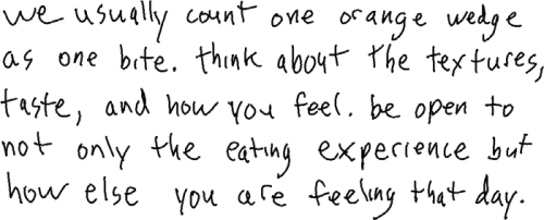 Ahora escribe. Anota los pensamientos o las emociones que surgieron durante la experiencia de pelar y comer. ¿Acaso el proceso tuvo que ver con algo más que la comida? ¿En qué sentido pelar la fruta es una metáfora de tu vida?