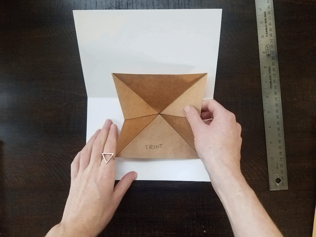 Open the square. Bring the middle of each outside edge up and towards each other to create a folded triangle. This will create the pop-up effect in your card.