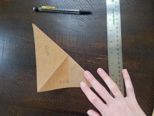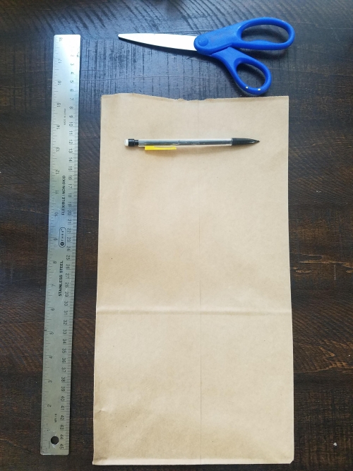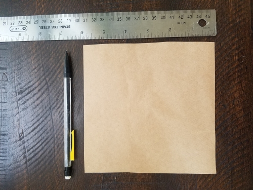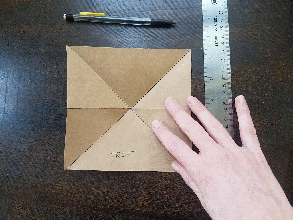 Download and print the pop-up template. Don’t have a printer? Make your own template with a paper bag! Measure and cut a 6” x 6” square piece of paper (could be from a brown paper bag like pictured). With a pencil, lightly label one side “BACK.”