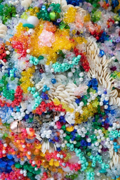 The Treasure House of Memory begins with a freestanding, three-panel painting—in the style of a room divider—depicting Saint George and the Dragon. The legend, in which the saint mounted on horseback slays a dragon who, demanding constant tributes, terrorizes a village, is a motif de Nieves regularly revisits. Nearby, a beaded sculpture with two contorted, interlocking bodies with horse heads appears to emerge from the painted scene; a process of transformation that develops in three subsequent figurative sculptures in various states of becoming a horse.