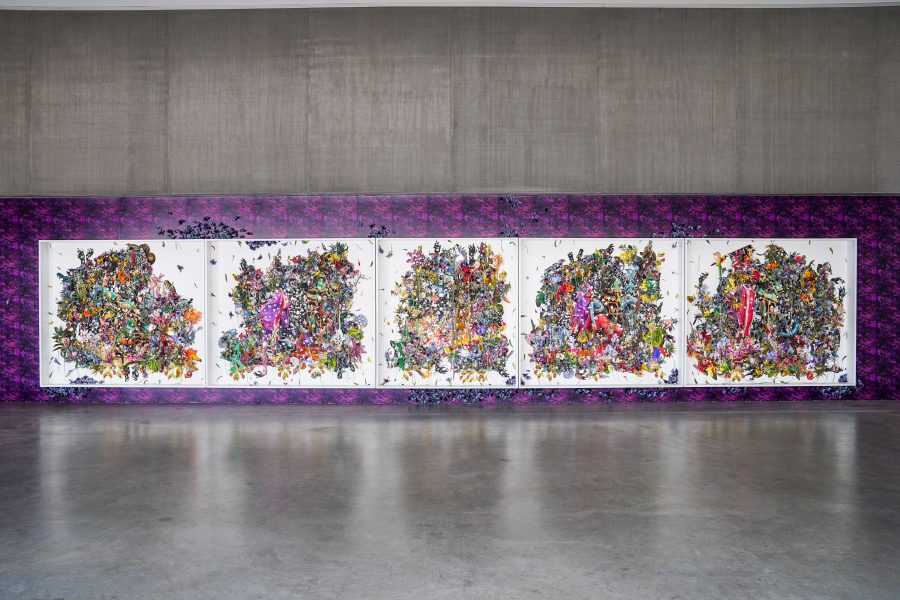 Ebony G. Patterson (b. 1981 in Kingston, Jamaica) is a mixed media artist whose elaborate and multi-layered installations and sculptures address diverse experiences of the Black diaspora. Her works frequently evoke luscious environments mixed with difficult and dark imagery, recalling ideas of growth and decay, entropy and creation, in the natural and unnatural worlds. Patterson lives and works between Kingston and Chicago.