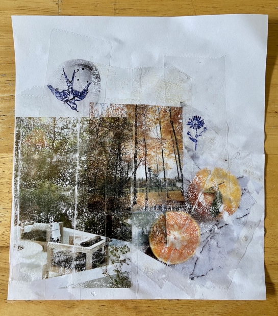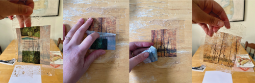 5. Once you have all your image transfers and they’ve dried, use them to create a collage. The transparency of the images let you play around with layering. You can collage just with your image transfers, on top of another piece of paper, or even on your window. You can also pair them with photographs, other magazine images, or drawings.