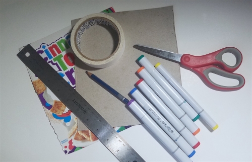 Scissors, markers, tape, a metal ruler, and the cut-out front and back of a cardboard cereal box.