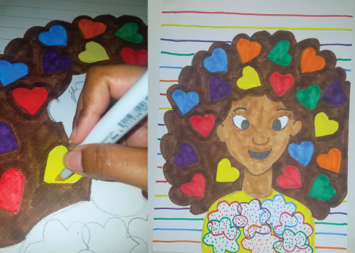 A stencil illustration of a dark-skinned girl with colorful hearts in her hair.