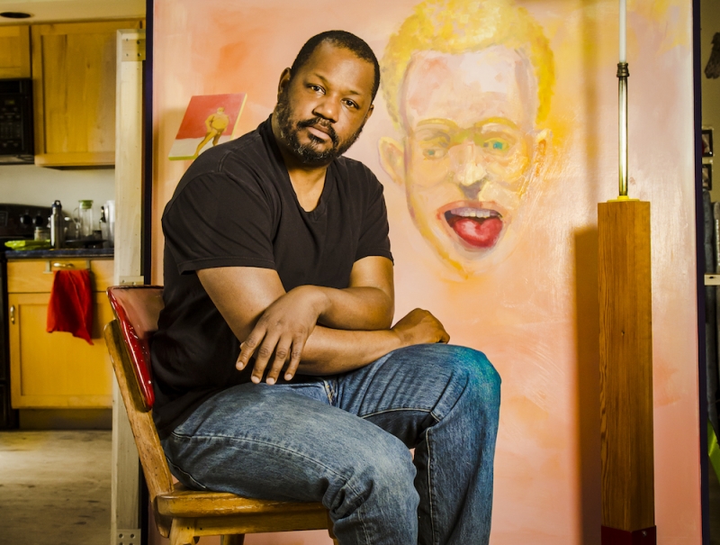 When we visited in March, artist Steve Locke’s modest, pleasingly cluttered live/work space in Hyde Park was dominated by the works he’d been preparing for his ICA show: several small paintings of men sticking out their tongues, mounted on brightly decorated pedestals using metal pipes, as well as one large wall painting, leaning near his kitchen.