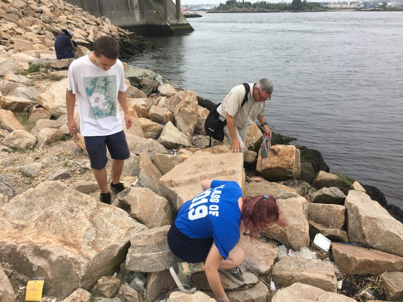 We sat on the rocky slope of a hurricane barrier at Fort Phoenix beach, enjoying the ocean view. It was a misty afternoon and not the sunlit August weather we expected. Mark pointed to the water, explaining that as a teenager this was his favorite spot for swimming and diving. It was peculiar to think of Mark Dion, now a major contemporary artist, being our age and jumping off cliffs with friends. As Mark shared his story, I looked below my feet and saw a red object peeking out from between rocks. I recognized it to be an inhaler, an odd item to find on a beach. Jokingly, I asked Mark if he wanted it, knowing his artwork incorporates found objects. I expected a laugh, but Mark instead accepted my offer and handed me a plastic bag to grab it. Within minutes, all of the Teen Arts Council had climbed down the dike’s boulders to search for hidden treasures with Mark Dion. Onlookers may have thought we were collecting beach trash. However, we saw ourselves as studio assistants, finding colorful pieces of plastic Mark would hopefully incorporate into his art at the ICA.