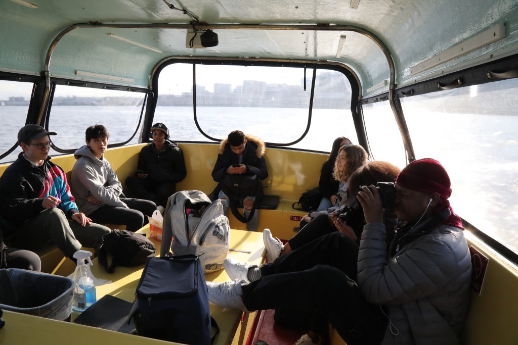As part of the ICA’s continued engagement with East Boston, the ICA Teens Special Focus and Advanced Digital Photography classes took a field trip on Saturday Dec. 1st to East Boston, in order to visit landmark sites, meet locals, and take pictures. We met at the ICA Seaport and took the water taxi across the harbor to Maverick Landing and walked to our first stop: Zumix, a long-running youth arts organization with a highlight on music and audio work.