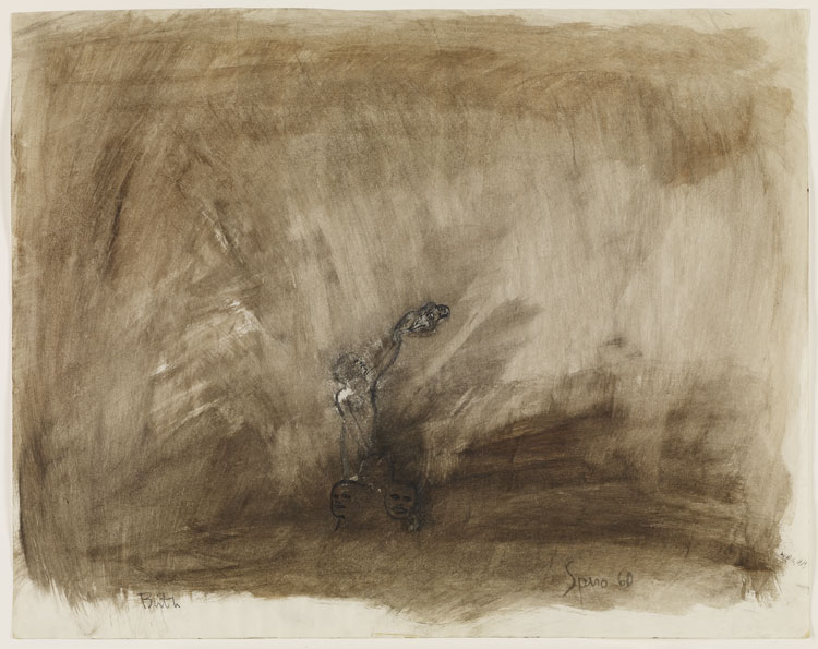 Sue Williams (Born 1954 in Chicago) came to prominence in the early 1980s for her densely composed, figurative paintings that explore the body and violence against women. Painted directly onto unprimed canvas, Future Angst with Capybara Lower Left is representative of Williams’s more recent work. Since 2017, she has been painting colorful, loose compositions where figurative elements intermingle with swaths of pure color. Williams is a skilled draftsperson whose early work was strongly influenced by cartoons and comic strips. In her recent, less crowded canvases, the quality of drawing is especially able to come through. While some figurative elements are identifiable—from naked bodies in ambivalent repose, to the titular capybara (a South and Central American species of rodent) at the canvas’s lower left—many elements are left unfinished or dissolve into meandering lines or patchy blocks of pale pinks, yellows, blues, and greens. Future Angst with Capybara Lower Left continues many of the themes and bodily motifs that characterized Williams’s early work, such as gaping bodily orifices and the omnipresent threats of violence and violation, while introducing Williams’s recent interest in open space and sketched renderings of figures.