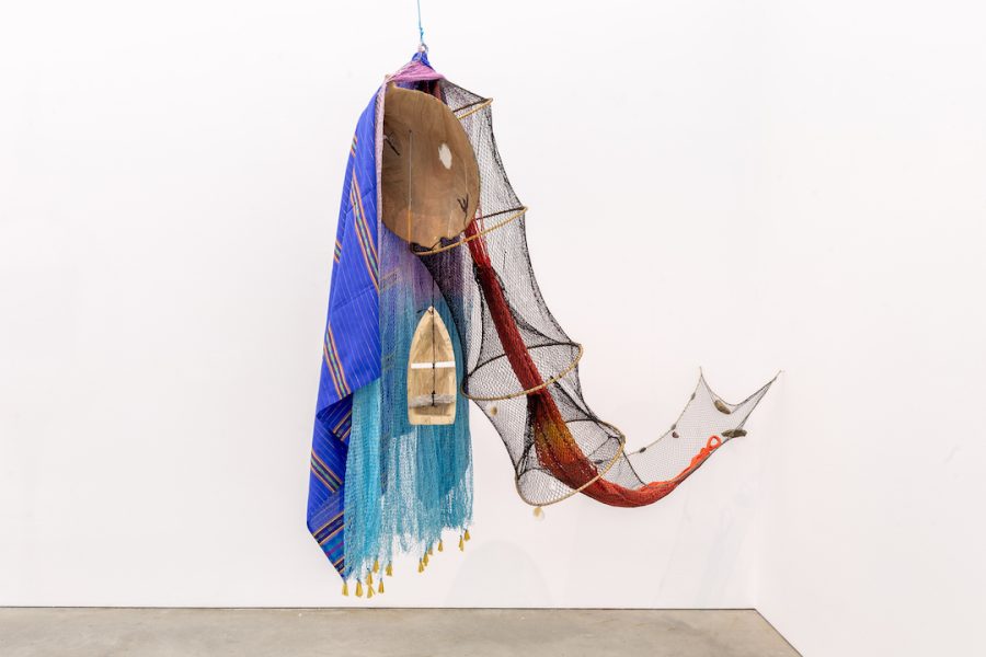 Carolina Caycedo, Flying Massachusett, 2020. Hand-dyed artisanal fishing net, artisanal fishing trap with floaters, hand-dyed artisanal hammock, traditional textile from the Zamboanga Peninsula in the Philippines, hand-carved wooden gold pan, hand-carved wooden boat, white shell, wooden needle, pebbles and stones collected from Boston Harbor, Blue Hills Reservation, and Neponset River, tin jingle cones, cotton thread, and paracord 93 x 166 x 23 inches (236.2 x 421.6 x 58.4 cm). Installation view, Carolina Caycedo: Cosmotarrayas, Institute of Contemporary Art/Boston, 2020. Photo by Mel Taing. Courtesy the artist and Commonwealth and Council, Los Angeles © Carolina Caycedo
