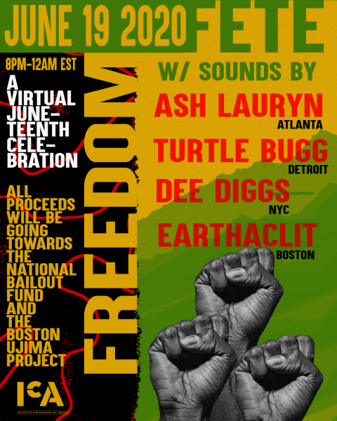 The DJs will be donating their tips to Boston’s Ujima Project and the National Bailout Fund, and the ICA is proud to support them. The Ujima Project is a cooperative business, arts and investment ecosystem, including a democratically governed investment fund. National Bail Out Fund is a Black-led and Black-centered collective of abolitionist organizers, lawyers and activists. The fund gives all proceeds to helping end pretrial detention for those who do not have the means to pay bail themselves. Show your support