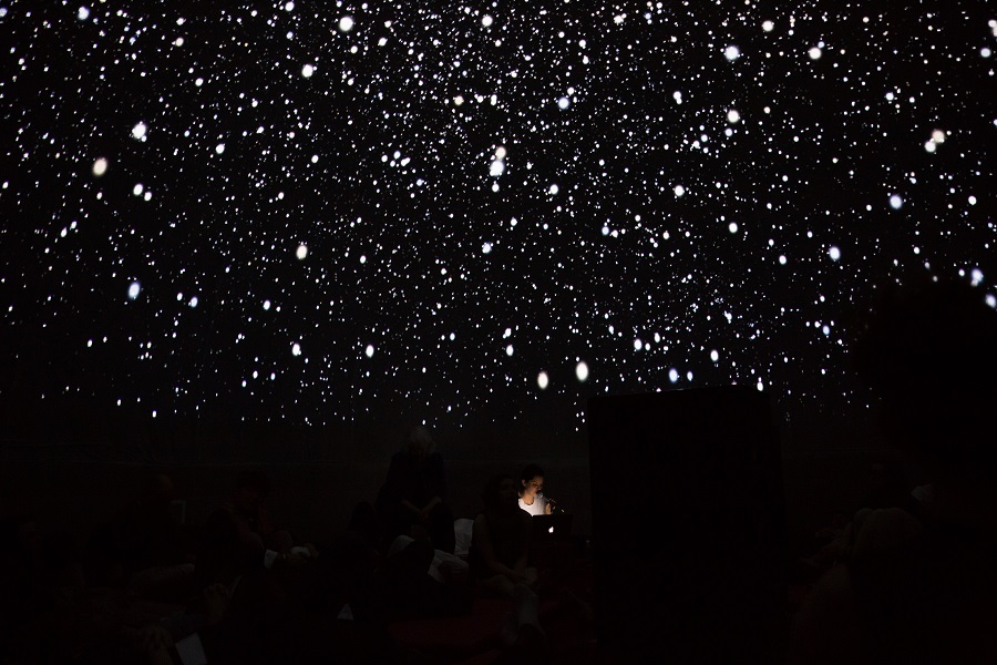 The Great Outdoors takes us on a sublime journey through inner space in the darkness of a planetarium. A lone performer reads texts culled from internet comments and fed through an algorithm, giving voice and body to the thoughts of countless individuals tapping away at their keyboards in isolation. As fragments of narrative emerge from the chatter, Dorsen invites us to imagine the internet’s infinite possibilities as a new form of celestial authority, and the comments as the internet’s id—unrestrained and protected by anonymity.