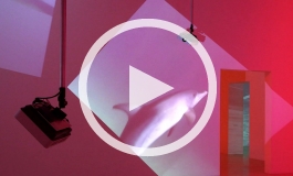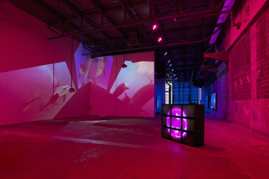 The installation centers on Thater’s artwork Delphine, reconfigured in response to the Watershed’s raw, industrial space and coastal location. In this monumental work, underwater film and video footage of swimming dolphins spills across the floor, ceiling, and walls, creating an immersive underwater environment. As viewers interact with Delphine, they become performers within the artwork, their own silhouettes moving and spinning alongside the dolphins’.