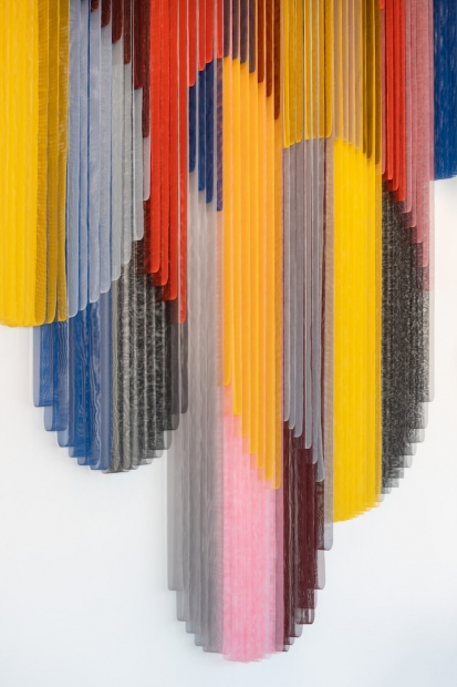 Eva LeWitt’s vibrant, handmade sculptures are fashioned from everyday commercial and industrial materials. She casts, dyes, and cuts these pliable, soft, and often synthetic materials before composing them in captivating arrangements of hanging geometric forms and gradations of undulating color. Her large-scale abstract artworks often recall domestic or theatrical decor, such as curtains, whose colors are meant to ”radiate heat” and ”generate energy,” according to LeWitt. Just as curtains evoke an interplay between inside and outside—marking a boundary between public and private or alternatively revealing and concealing—LeWitt’s intuitive material arrangements play with unresolved tensions: between transparency and opacity, gravity and weightlessness, abstraction and decoration.