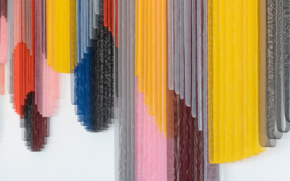 Eva LeWitt’s vibrant, handmade sculptures are fashioned from everyday commercial and industrial materials. She casts, dyes, and cuts these pliable, soft, and often synthetic materials before composing them in captivating arrangements of hanging geometric forms and gradations of undulating color. Her large-scale abstract artworks often recall domestic or theatrical decor, such as curtains, whose colors are meant to ”radiate heat” and ”generate energy,” according to LeWitt. Just as curtains evoke an interplay between inside and outside—marking a boundary between public and private or alternatively revealing and concealing—LeWitt’s intuitive material arrangements play with unresolved tensions: between transparency and opacity, gravity and weightlessness, abstraction and decoration.