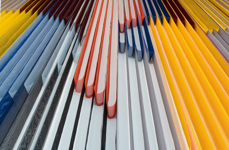 Conceived for the ICA’s Sandra and Gerald Fineberg Art Wall, and structured by the particular shape of the museum’s architecture, Untitled (Mesh Circles) is a monumental sculpture made of bands of colorful coated mesh fabric whose shifting linear composition creates a number of interlocking circular forms. While coated meshes have a variety of uses ranging from privacy screens to high-visibility workwear, LeWitt transforms lengths of the tensile fabric into an unfolding environmental sculpture that intensifies the experience of space. As the crosshatched surface pattern and fields of color overlap and respond to ambient conditions like sunlight and circulating air, a moire effect is produced: a shimmering pattern that occurs when two geometrically regular patterns are superimposed. Untitled (Mesh Circles) creates a dynamic and uplifting experience that vibrates throughout the museum’s interior.