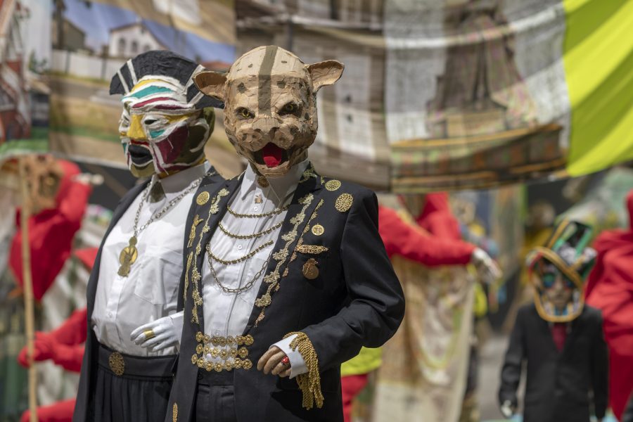 A procession of sculpted figures with colorful clothing, flags, and masks.