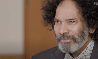 A older person with curly dark hair and white beard stands in front of sculptures out of focus