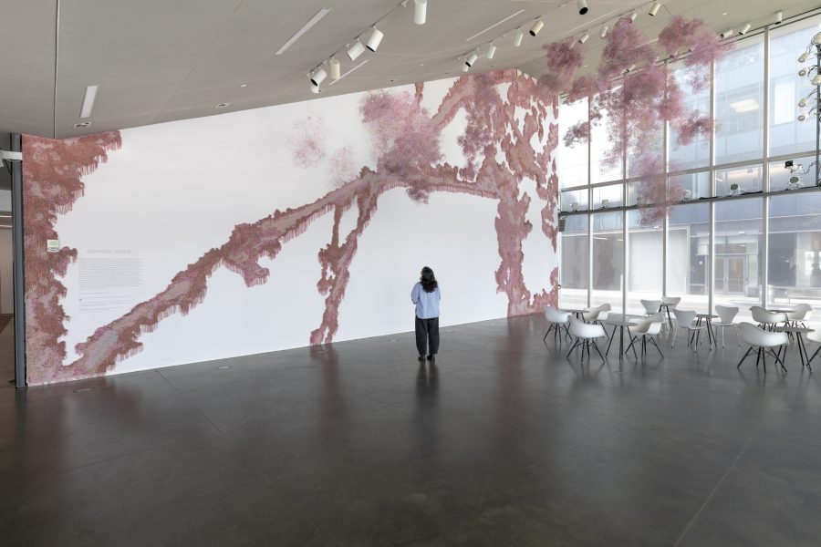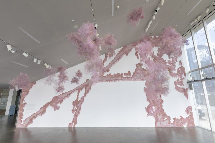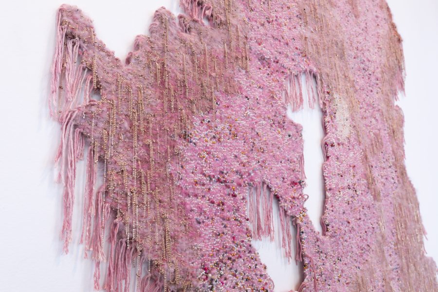 Lynloop, Adams’s monumental new commission for the ICA/Boston, is a multipart experimental weaving developed in response to the architecture of the museum and the artist’s childhood memories. It is based on aerial images of the intersecting footpaths between a sports field and a walled-off recreational space south of where Adams grew up. Through the work, Adams considers the impact of childhood experiences and memories on the trajectory of one’s life. He writes, “In sitting with the discomfort of growing up among these hypermasculine spaces, the installation explores how I have had to superimpose my own fantasies onto memories in a way that softens the hard edges and coldness of this area.” In hues of pink with beads, rope, chain, and mohair, Lynloop is a stunning and tactile mapping of space, human interaction, and memory.