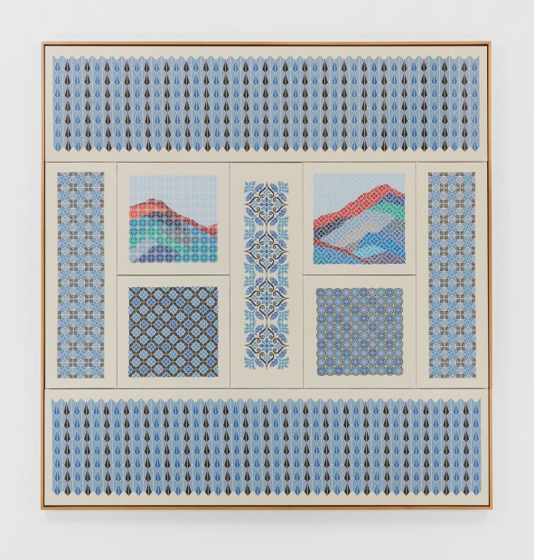 Nassar, embroidery holds a tension between conflict and harmony in the relationship between stitch and thread, color and pattern. These painterly panoramas fuse complex patterning with close attention to form and color, and appear to exceed the boundaries of their frames to travel across the canvas and beyond it, suggestive of an expansive sky or a boundless horizon.
