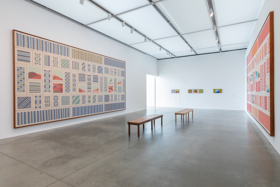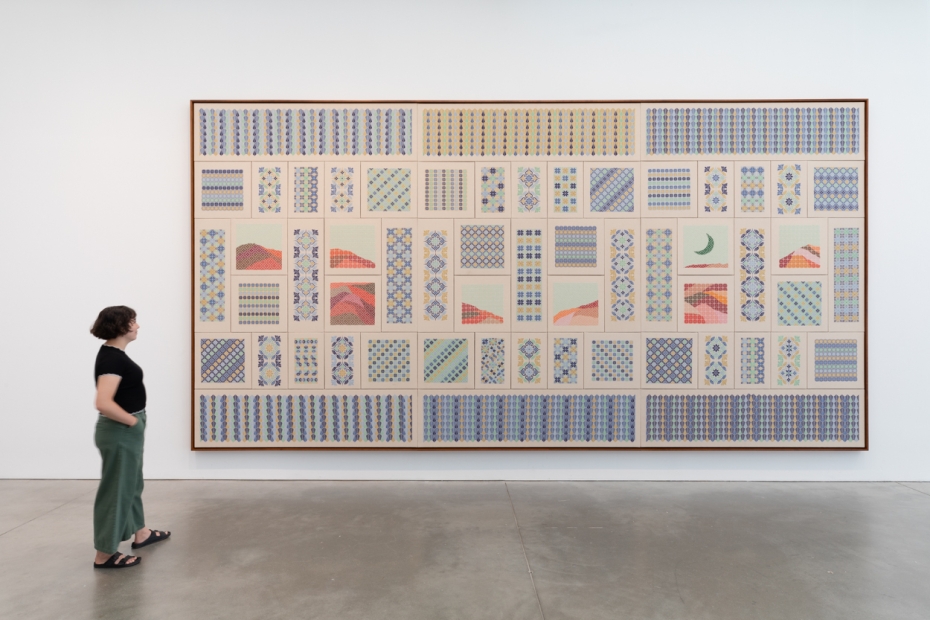 Nassar, embroidery holds a tension between conflict and harmony in the relationship between stitch and thread, color and pattern. These painterly panoramas fuse complex patterning with close attention to form and color, and appear to exceed the boundaries of their frames to travel across the canvas and beyond it, suggestive of an expansive sky or a boundless horizon.