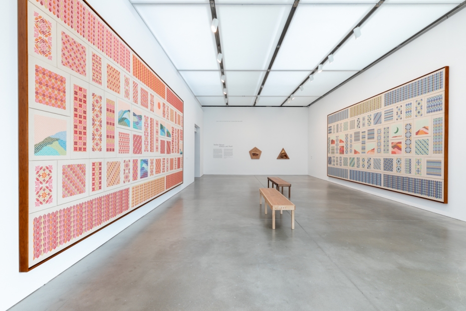 Jordan Nassar’s solo exhibition—his first in Boston—presents a selection of his intricate embroidered and mixed media works. Nassar (b. 1985 in New York) draws on traditional Palestinian craft techniques to investigate ideas of home, land, and memory. His work, which he creates in collaboration with Palestinian embroiderers and craftspersons, combines geometric patterns with abstracted landscapes, imbued, in the artist’s words, “with yearning, while hopeful and beautiful.” Through complex patterning and a unique attendance to form and color, the painterly aesthetic of Nassar’s embroidery allows the artist to explore relationships between craft and history in new contemporary dialogues.