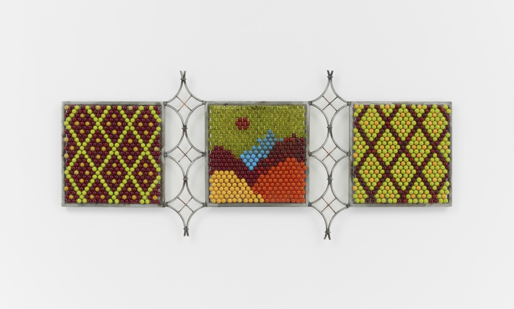 In recent years, Nassar began working in traditional Palestinian glasswork techniques as well as inlay woodcrafts. To make the glassworks in this gallery, the artist arranged glass beads, which he hand-flamed, onto a steel armature similar to decorative latticework, drawing on techniques of the glass factories of Hebron, a practice dating back thousands of years. In the wood pieces also on display, Nassar creates new sedimented topographies through the layering of natural grains with hand-inlaid brass and mother of pearl; these materials recur in the artist-made benches in this gallery.