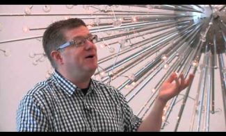 It was Weinberg who suggested the idea for the sculpture, based on the Sloan Digital Sky Survey’s current efforts to chart the whole of the cosmos, one dime-sized portion at time. Powerful telescopes from a New Mexico observatory focus on a specific patch of sky, and physically record the visible objects by perforating holes in a metal plate. One such disc forms the structural basis ofStudy for The Center Is Everywhere, which abstracts and stylizes actual celestial bodies. Streaming downward from the central disc, the sculpture bursts with information, with its hand-cut crystals signifying stars and galaxies, while the brass rods tipped with light bulbs represent distant quasars.