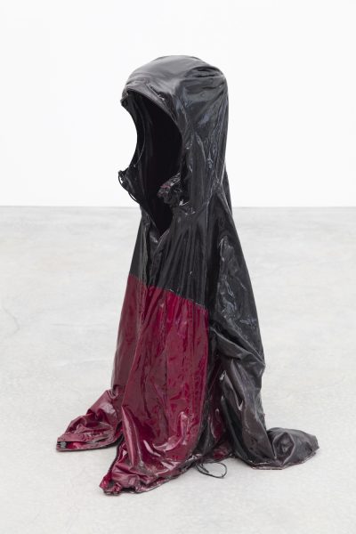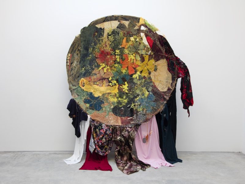 Beasley’s early works harnessed the physical qualities of sound, deploying vibrations and echoes that penetrate the bodies of both performers and audience. He has embedded microphones and other electronic musical equipment in sculptures made of sneakers and foam, manipulating their sonic possibilities in his live performances. Found objects and clothing, often the artist’s own, are central in Beasley’s diverse sculptural work, ranging from compositions of shredded t-shirts and hoodies to fitted hats, do-rags, and basketball jerseys. More recent works are constructed from colorfully patterned housedresses stiffened with resin that stand on the floor and protrude from the walls, at times hardened over sound-baffling foam panels or concave forms that Beasley refers to as “acoustic mirrors.” Appearing like satellite dishes or clusters of ghostly figures, these works become conduits for absent bodies and histories that the artist evokes through color, pattern, and texture. Rather than contrasting the materiality of objects to the immateriality of music and performance, as is so often the case, Beasley forges strong affinities between the physical and the aural in his multidisciplinary practice.