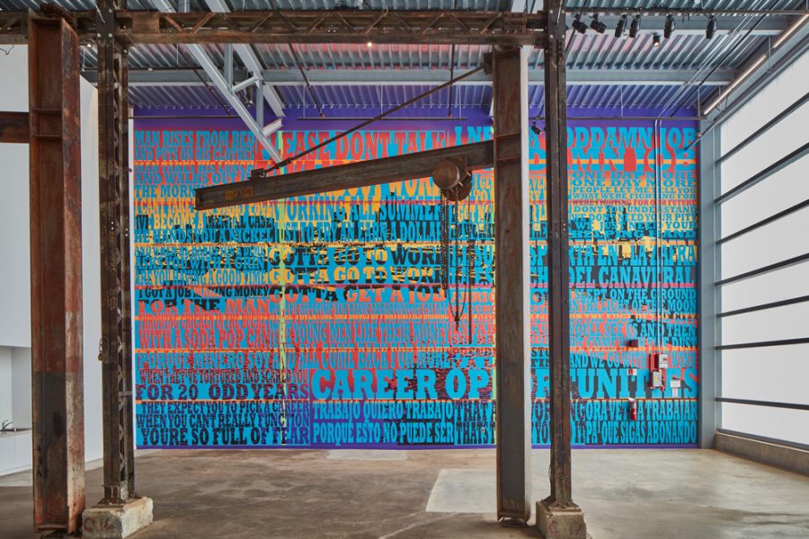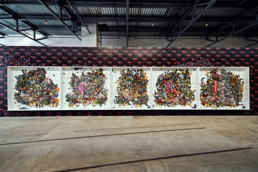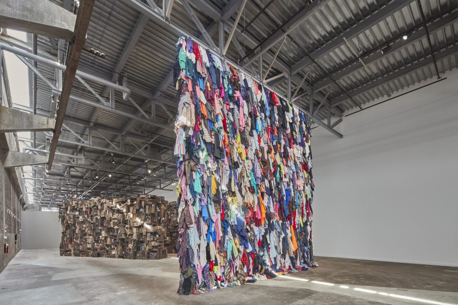 Participating artists include El Anatsui (b. 1944, Anyako, Ghana), Madeline Hollander (b. 1986, Los Angeles), Ibrahim Mahama (b. 1987, Tamale, Ghana), Karyn Olivier (b. 1968, Port of Spain, Trinidad and Tobago), Ebony G. Patterson (b. 1981, Kingston, Jamaica), and Joe Wardwell (b. 1972, Chapel Hill, NC). Making visible the often invisible forces that shape human experiences, these artists reflect on the systems of industry, nature, and society in monumental artworks. For some, recycled objects expand ideas of materiality and industry in daily life: Anatsui collects bottle caps and other refuse to form glittering, tapestry-like sculptures; Hollander programs automobile head and taillights to blink with the movement of traffic; and Patterson makes intricate collages of flowers, birds, butterflies, and figures. Olivier and Mahama collect used clothing and crates, respectively, to build towering sculptures that reflect on human persistence, labor, and ingenuity. Wardwell, a Boston-based artist, will create a new, site-specific installation in dialogue with the rich history of labor songs. Together, these artworks capture the power of reuse, resilience, and reclamation, celebrating a revival of the everyday at monumental scale.
