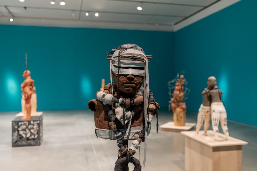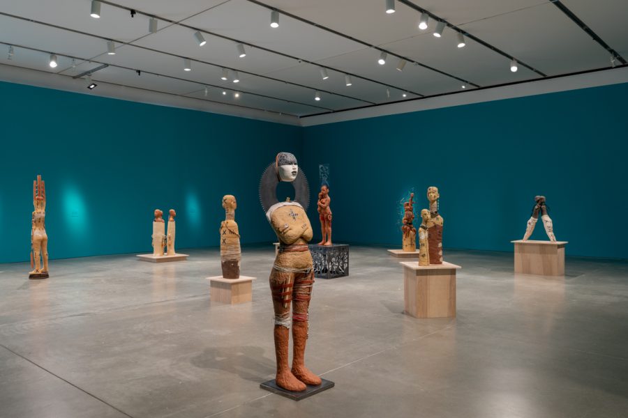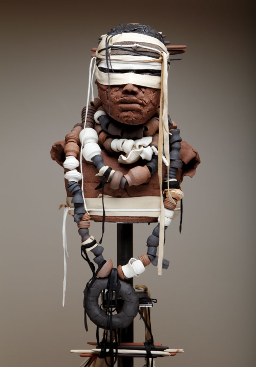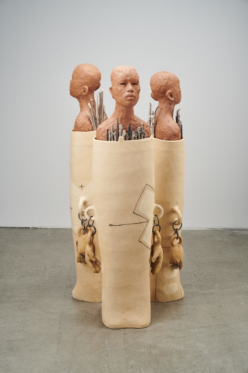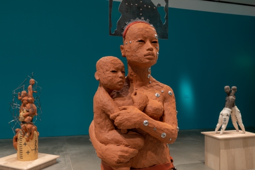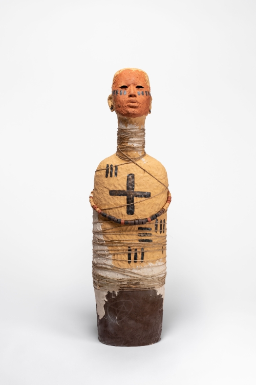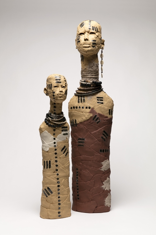 Legacies is a focused presentation of Simpson’s ceramic sculptures dating back to 2014, with an emphasis on more recent and newly created work, including individual figures, pairs, and groupings. For Legacies, Simpson’s signature themes and approaches to working with clay are brought together in an open floor plan gallery. These 14 often androgynous sculptures incorporate metal, wood, leather, fabric, jewelry, and reclaimed materials, and are frequently marked with a “+” or an “×,” symbols for direction and protection, respectively. Many of Simpson’s works consider themes of motherhood, intergenerational relationships, or personal growth, while others stand as safeguards against legacies of violence. Rooted in ideas of nurture and repair, each sculpture is heavily worked by hand, featuring a richly textured surface that conveys Simpson’s depth of engagement with her subjects and her expertise in giving form to clay. Through such evocative, tactile sculptures, each with their own commanding presence, Simpson’s work is intended, as she has said, “to translate our humanity back to ourselves.”
