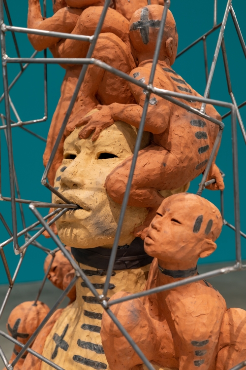 In Storyteller, an intricate metal armature materializes from the mouth of a large ceramic bust. The armature contains within it a group of seven smaller figures encircling the bust, who cannot escape the containment of the armature. Indeed, the armature enters the bodies of each of the smaller figures, suggesting that the storyteller breathes life into them even as they are held inextricably fixed by the story.
