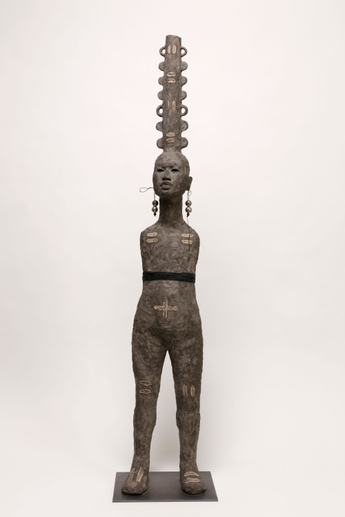 Heights I (original) is an androgynous standing figure, child size in scale, with a series of cuplike vessels growing upward from its head. The armless figure is adorned with silver bell earrings, with holes for eyes to create a witness point for the being to find direction. Here, the body is a vessel whose upward reaching suggests personal growth and the impulse to aspire to new levels of consciousness.