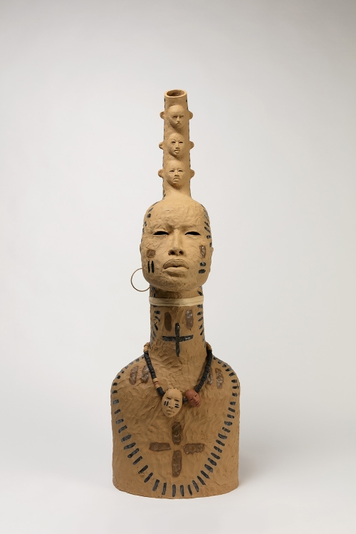 Reincarnation II is a bust featuring distinct jewelry and bodily markings, with a pipelike form extending upward from its head. Three faces are emerging from the form, with two more as pendants on a necklace made of ceramic beads. These five faces signal the presence of ancestors (from both past and future) in our lives, and how each of us carries as part of ourselves those who came before us as well as those who will follow.