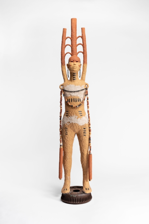 Part object, part figure, Truss is an armless figure with unique beaded jewelry standing perched atop a break drum. A truss is an engineering assemblage, typically made of three conjoined members in the shape of a triangle, or combination of triangles, to create a rigid, supportive structure. Here, the six arches of Simpson’s Truss recalls an aqueduct and grows from the figure’s head and shoulders. This particular truss suggests a kind of support for the figure who wears it, an extension of the body through which there is a direct movement of forces from the individual to a higher form of consciousness.