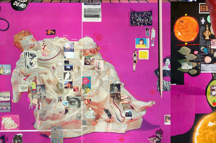 The colorful and layered photographs, films, and installations of Sara Cwynar (b. 1985, Vancouver) examine the excess of pictures in today’s image-saturated culture. For the Sandra and Gerald Fineberg Art Wall, the artist imagined a newly created photo mural centered on an alphabetical list of terms drawn from internet search engines. These include words suggested by search engine algorithms in response to Cwynar’s online activities and some of the most popular search terms since 2020. The artist represents the terms through commonplace image types: the reclining woman, domestic objects, perfect looking food, familiar logos, luxury cars, and more. These images are complemented by handwritten annotations which create conceptual connections and raise questions about the relationship between these eclectic images and their index of terms. Cwynar draws on the principles and history of billboard design to create her mural, where what is being “advertised” is the seductive power of commodities and searching in our contemporary moment.