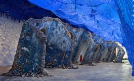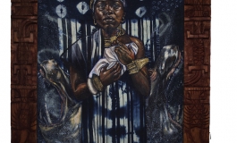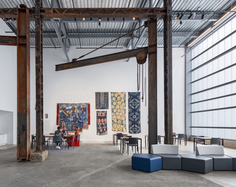 On display in the ICA Watershed Harbor Room is a project by Boston-based artist Stephen Hamilton highlighting the generations-long tradition of indigo dyeing in West Africa too often ignored in the accounting of early American history. Included is Hamilton’s painting Owners of the Earth (2020), a richly layered mixed-media work that refers to traditional artforms and philosophies from the Yoruba people in West Africa. The work is accompanied by a description of the unrecognized historical contributions of West Africa to indigo use in the Americas and educational materials depicting indigo dying techniques that the artist adopted during his research in southwestern Nigeria. Hamilton brings these histories—referenced in Firelei Baez’s monumental Watershed installation currently on view—to life through words, images, and textiles.