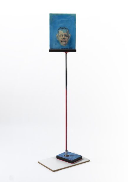 The male faces in Locke’s portraits float disembodied within the canvas, evoking a range of references—from the myth of Medusa to historical traumas such as the French Revolution or the lynching of African-Americans to current anxieties about terrorism, war, and torture. In addition to this layered and nuanced field of associations, Locke is also experimenting with a variety of display strategies for paintings. Whether embedding them in the wall of the museum, or propping them onto sculptural supports, Locke’s treatment of oil paintings—traditionally simply hung on the wall—is commensurate with his complication of our conventional images of men. In both instances, Locke’s work pushes boundaries and suggests subtle hopes for new ideas and expanded freedoms.