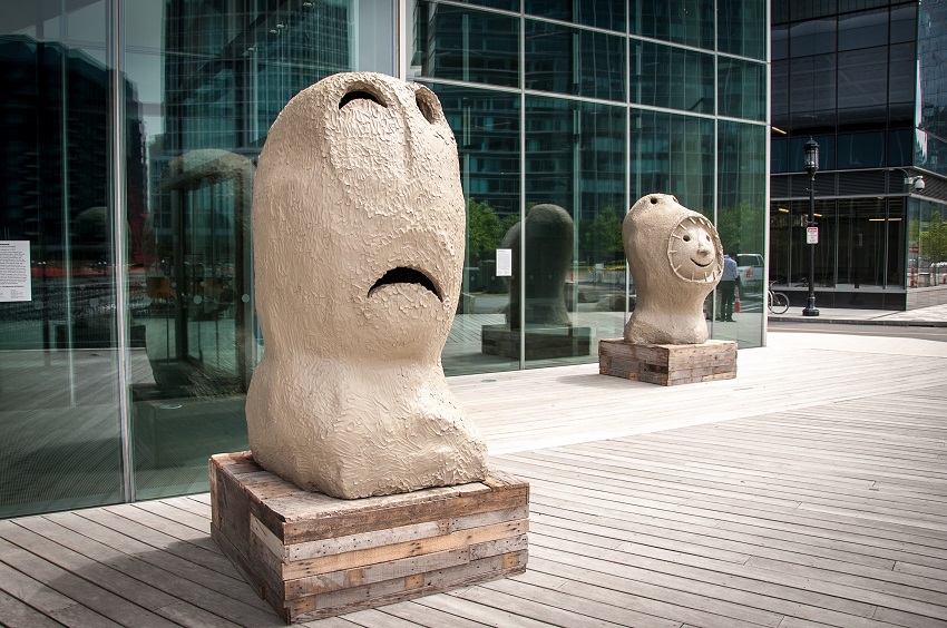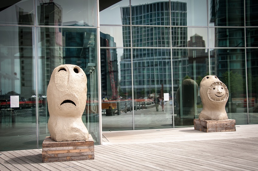 Best known for his large-scale sculptures and installations, Ugo Rondinone (born 1964, Brunnen, Switzerland) works in a diverse range of media, including drawing, painting, photography, and video. Rondinone’s series Moonrise—his first figurative sculptures—are eight-foot-high busts derived from masks. Modeled in clay before being cast in aluminum and painted, the sculptures show the enduring marks of the artist’s hand. Rondinone has long been interested in the subject of time, and he represents it here by the relationship between moon, tide, and calendar: each of the twelve sculptures in the series was made in homage to the moon and is named after a month of the calendar year. Two of the twelve are on view here. These monumental visages, with playfully distorted faces that smile and grimace, convey a kind of uncanny romanticism, welcoming wonder and empathy in equal measure.