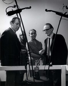 Artist Marcel Duchamp and three others before an artwork of violins on rods at the opening of Art Turned On, 1965
