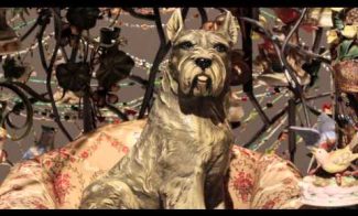 • A detailed statue of a dog sits on a floral-patterned cushion against a backdrop of decorative vines and birds, creating a whimsical atmosphere. Play Button