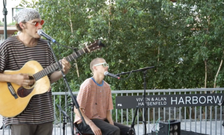 • A street musician plays an acoustic guitar and sings into a microphone. Another person sits beside him, also singing into a mic, in front of trees and a sign that reads Vivian & Alan Hassenfeld Harborwalk. Play Button