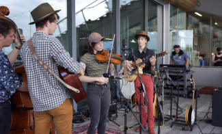 • A group of musicians play instruments outdoors. One person plays a violin, another a guitar, and a third on double bass. A person is also seen at a keyboard setup in the background. They perform near a large glass window. Play Button