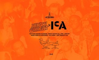 • Orange-toned event poster featuring text: Live on Vimeo, AllYouCanEat x ICA with artwork of a reclining person. Event details: Friday, August 21st, 8PM - 11PM EST. Music from AllYouCanEat, Silk 804, Don’tSweatIt (JA). 16:9. Play Button