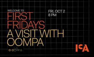 • Event announcement with text: Welcome to First Fridays A Visit with Oompa. Fri, Oct 2, 8 PM. Includes a grid background with ICA and a stylized signature in the corner. Play Button