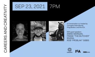 • Promotional image for a conversation event, Careers and Creativity, on Sep 23, 2021, at 7 PM. Guest speakers listed are Annie Morgan, Frank The Butcher Rivera, and Rob Problak Gibbs. Co-hosted by Concepts International, King Boston, and the ICA. Play Button